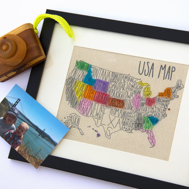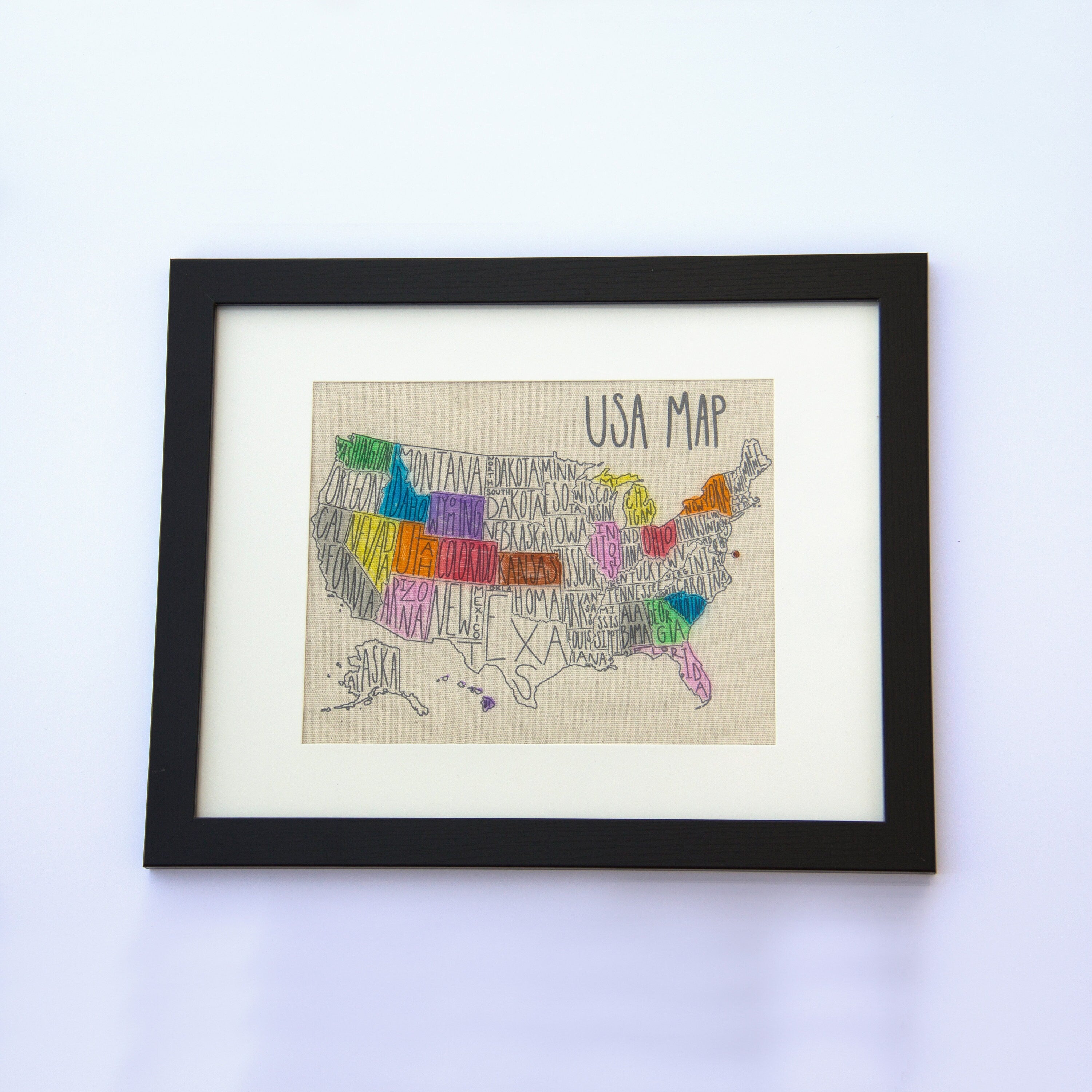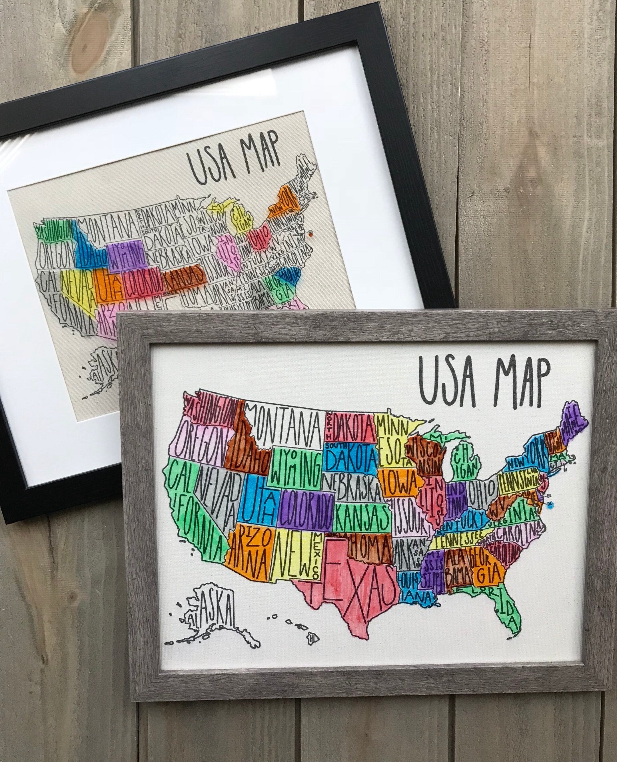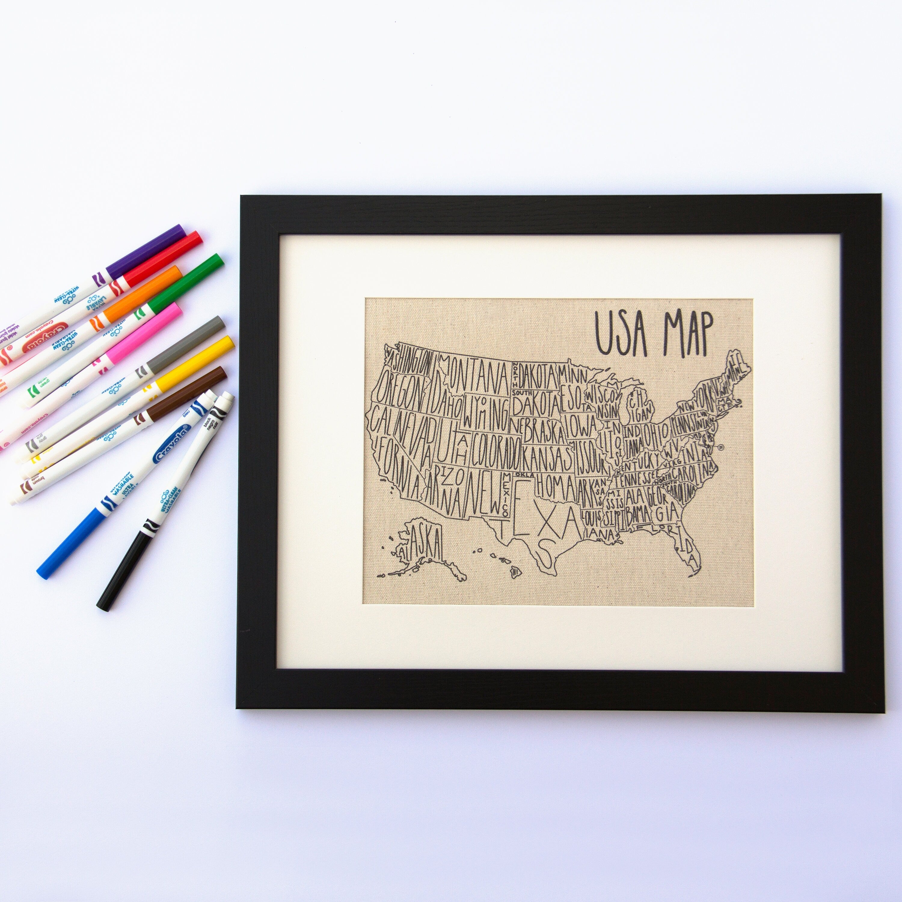 This USA Map print with hand lettered state names would be a perfect way to track travel, family vacations or sales! This map is printed on a beautiful 100% cotton canvas. This makes such a fun and unique gift for couples and families! This is a beautiful print and can be used in so many ways! Frame under glass to use as a Color by State map! Just use washable markers to color on the glass! Or mount over a cork or foam board to create a push pin map!