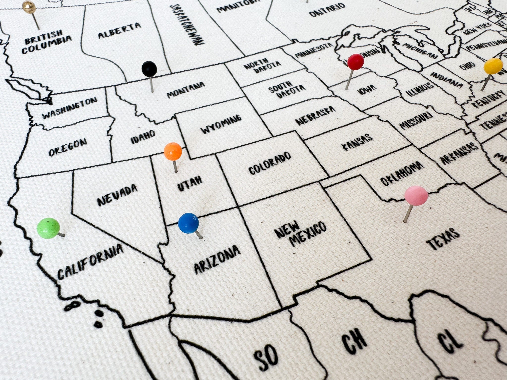 DIY Kit Push Pin Map North America, Custom Title, USA Canada Mexico, Color by State Tracker, Cotton Canvas Anniversary Gift, Vacation Log