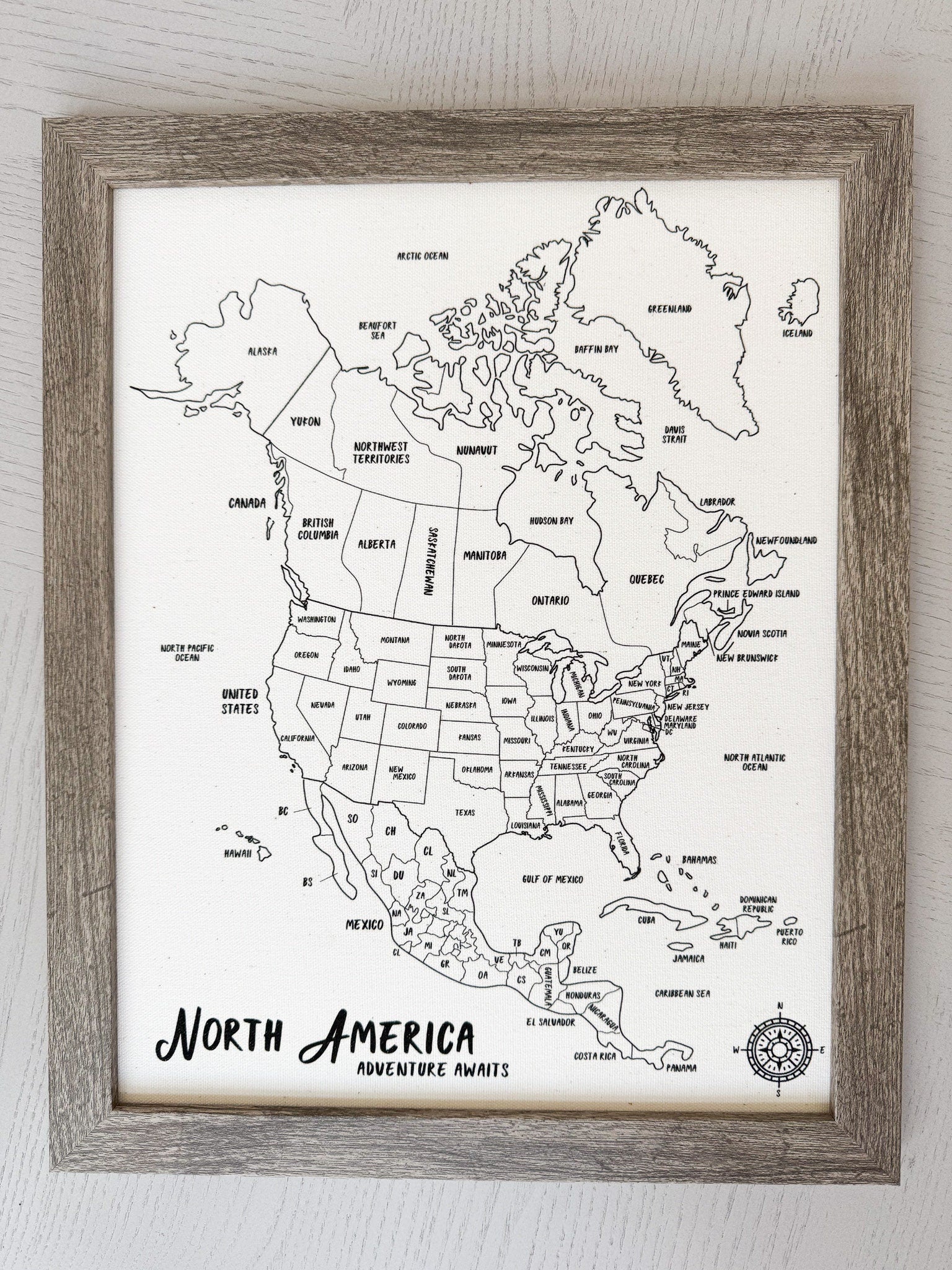 DO IT YOURSELF - This DIY Kit North America and Central America Map print with a classic font state names would be a perfect way to track travel, family vacations or adventures! This map is printed on a beautiful 100% cotton canvas. This makes such a fun and unique gift for couples and families!