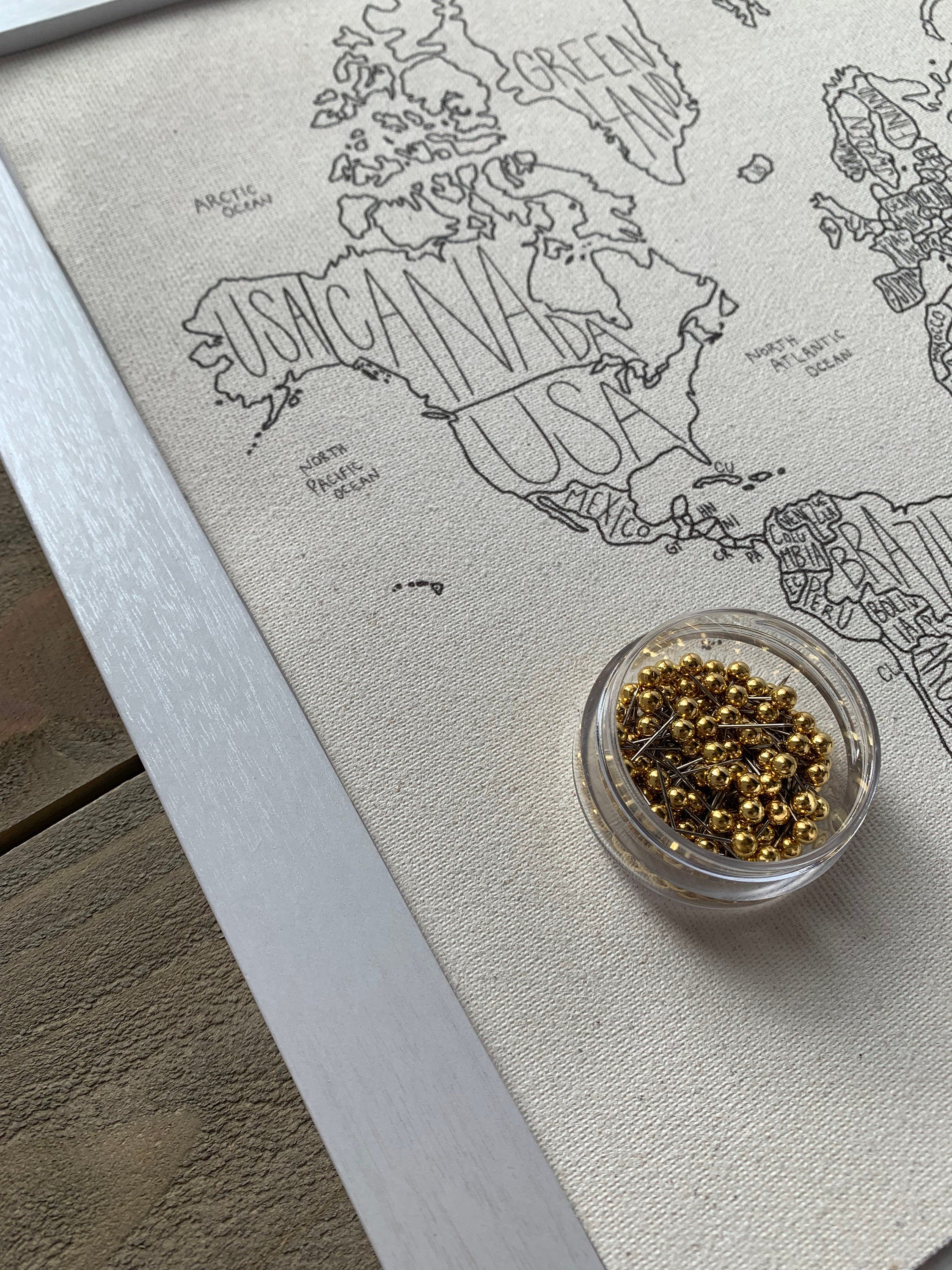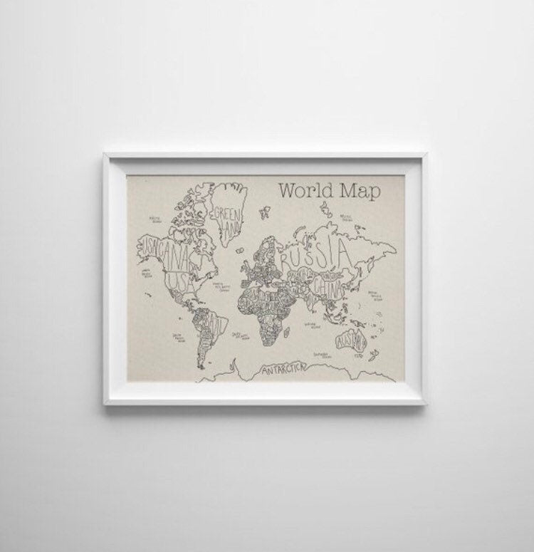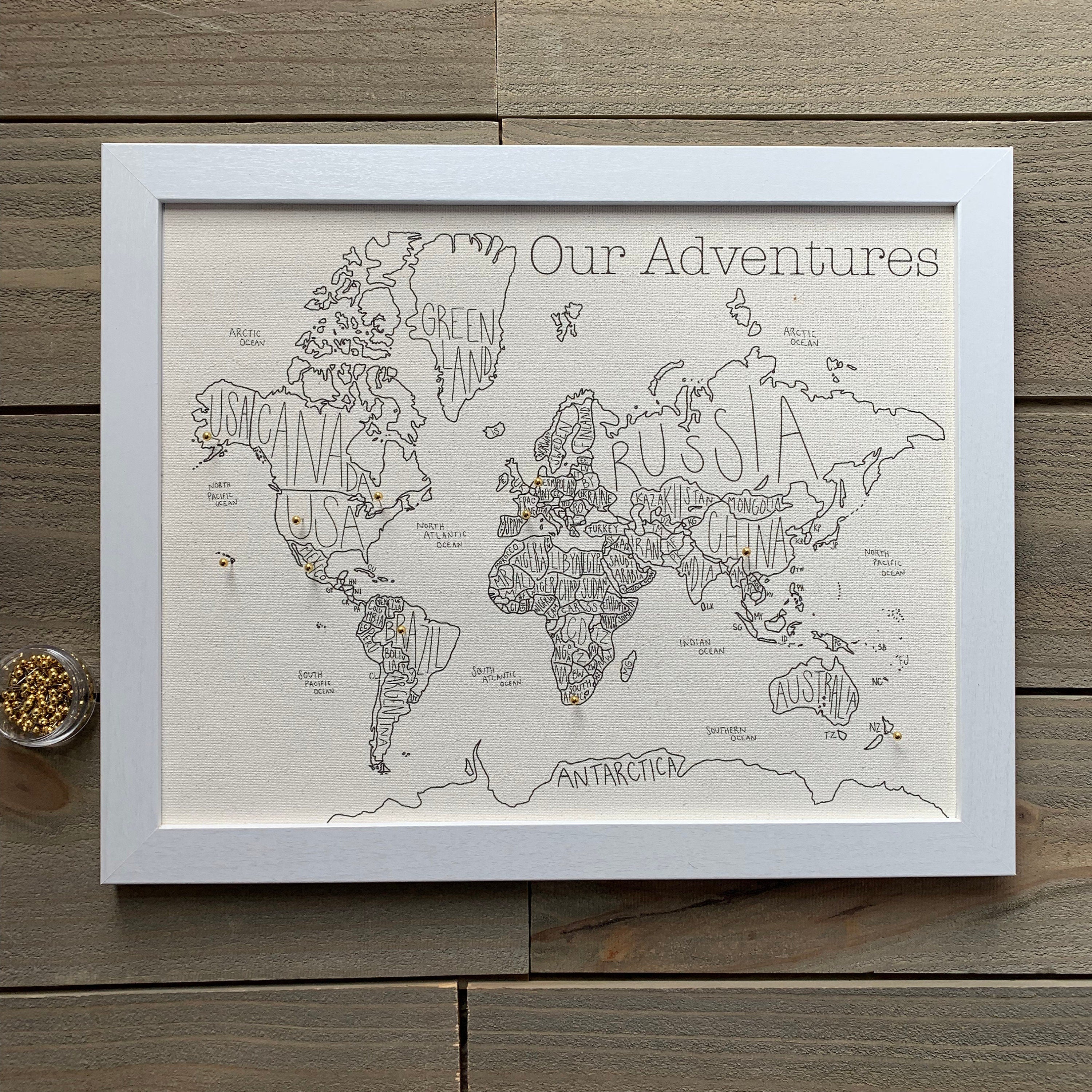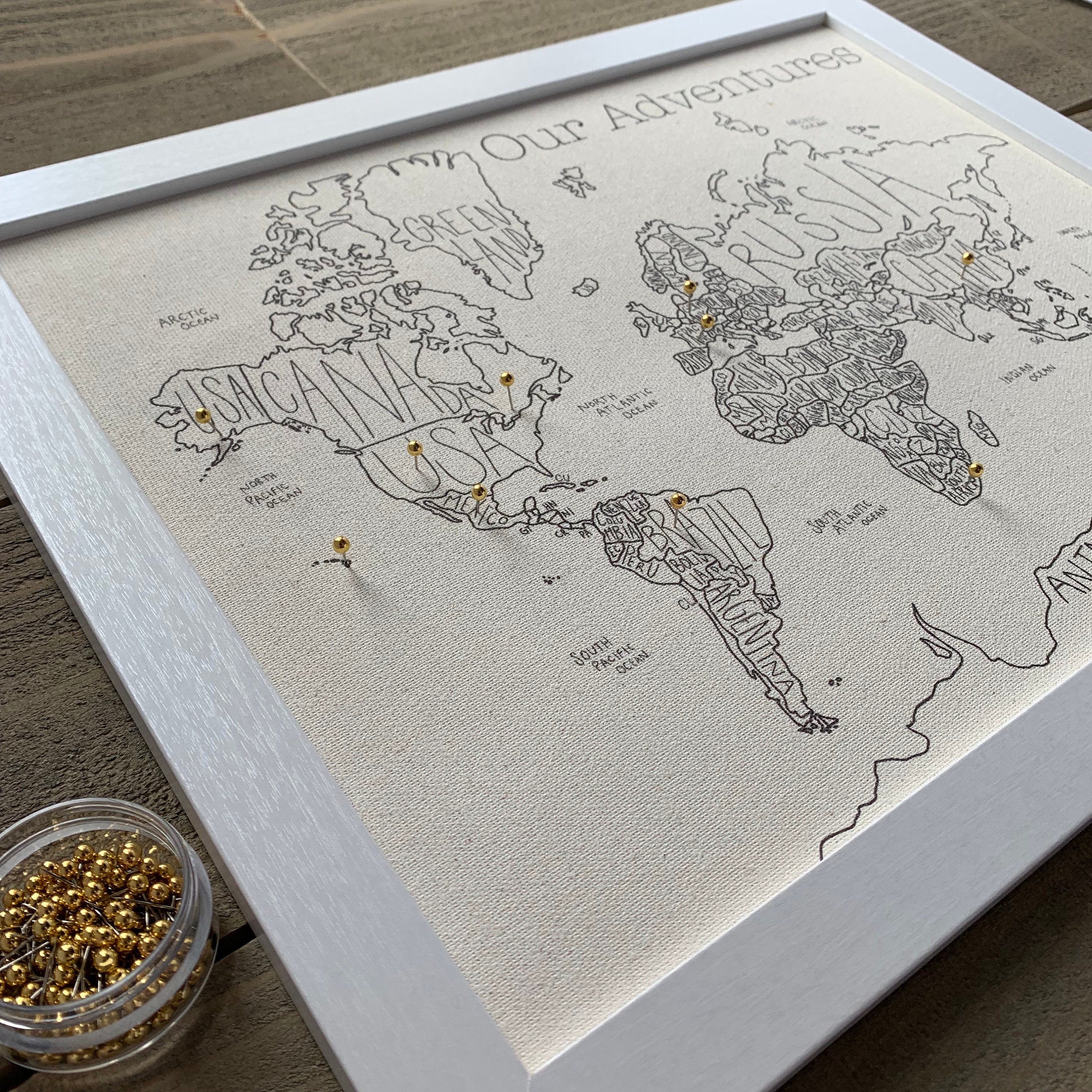 Make your own World Travel Push Pin or Color by Country tracking map! This World Map print with hand lettered country names would be a perfect way to track travel, family vacations or sales! This map is printed on a beautiful 100% cotton canvas. This makes such a fun and unique gift for couples and families! This is a beautiful print and can be used in so many ways! Frame under glass to use as a Color by Country map! Just use washable markers to color on the glass! Or mount over a cork or foam board to create a push pin map!