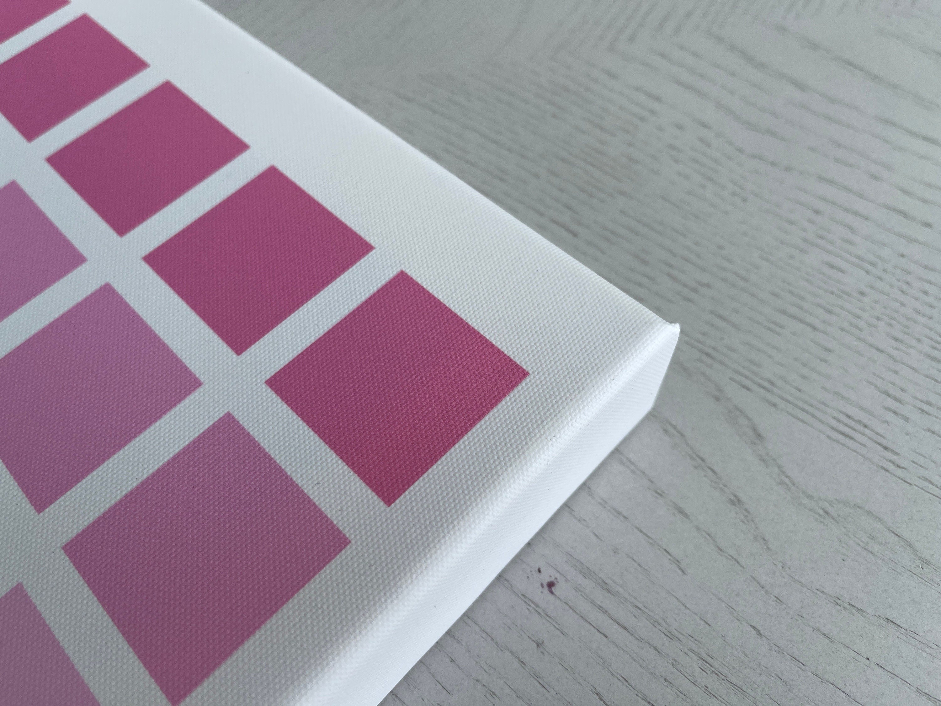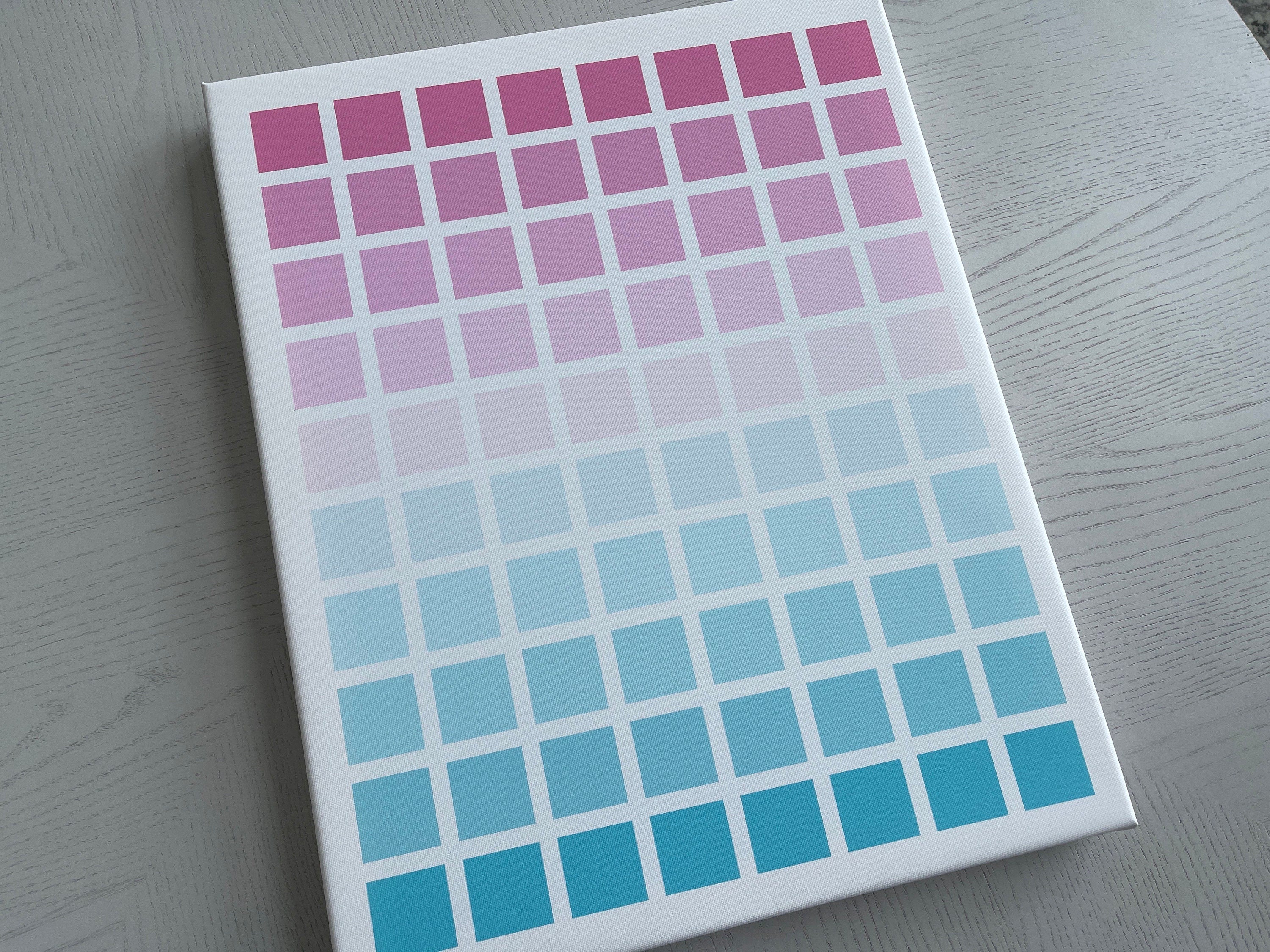 Introducing the Enamel Pin Collection Display - the perfect addition to any pin collector's showcase! This large wrapped canvas with a striking white background and pink and teal ombré ink squares provide the perfect place to display your pins. It's a beautiful and stylish way to display your collection of enamel pins and showcase where you've collected them from.