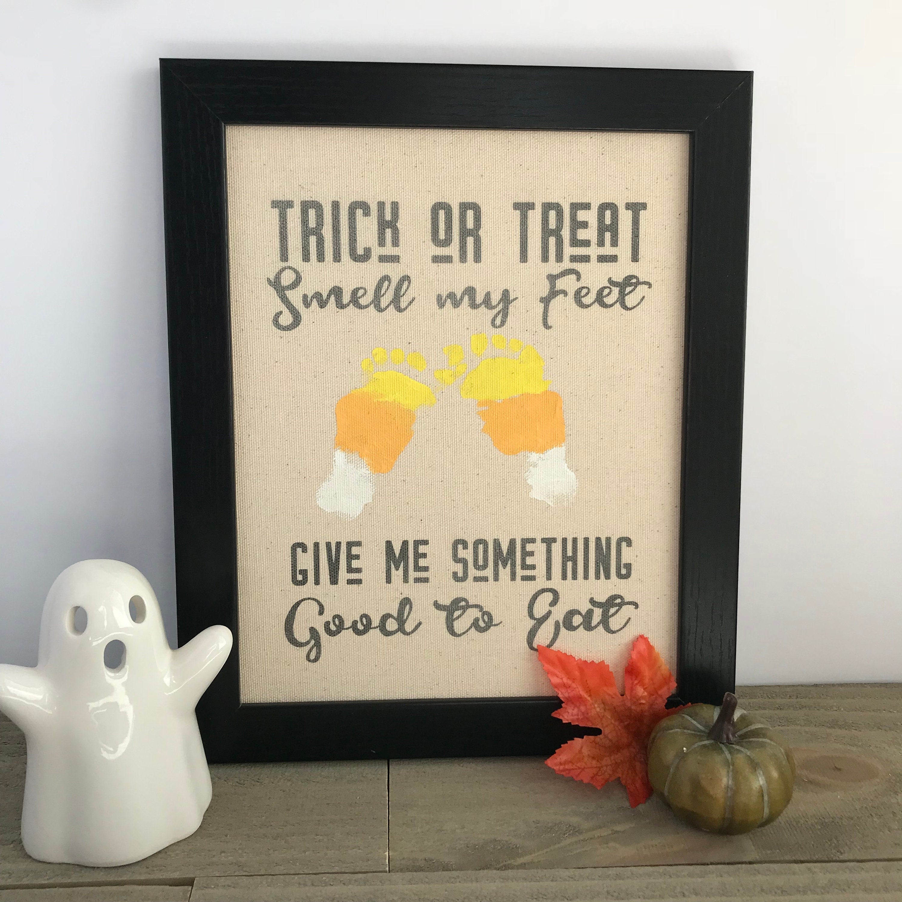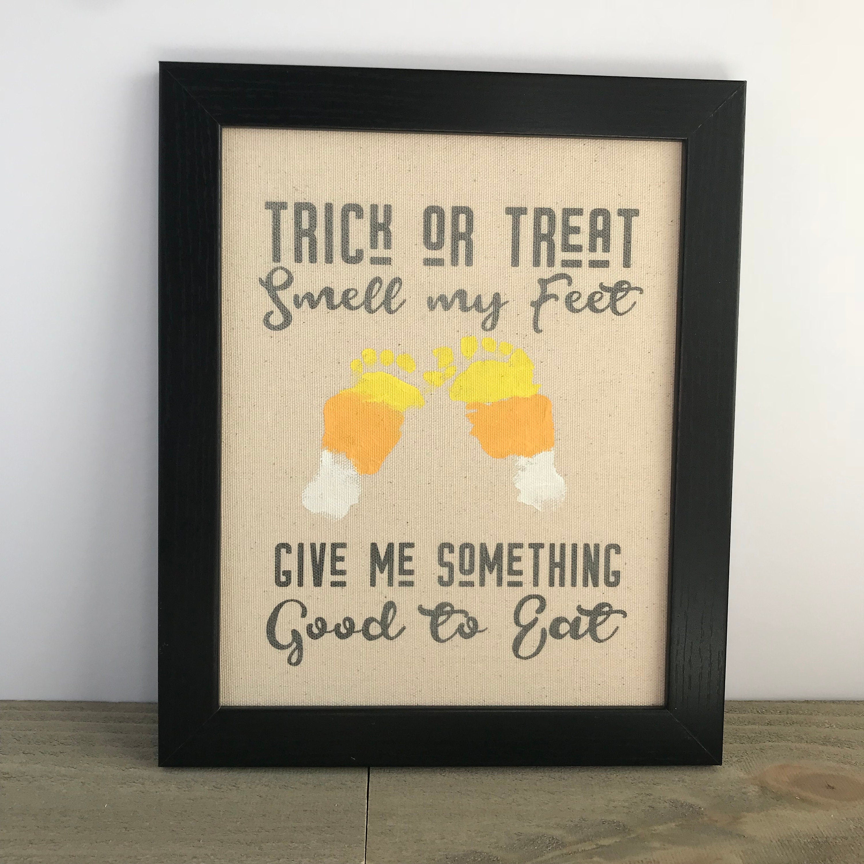Trick or Treat, Smell my Feet, Give Me Something Good to Eat! Such a perfect quote to show off your adorable baby's footprints. Perfect way to remember your little one's first halloween and always remember how sweet their little footprints are! Makes the perfect keepsake to decorate with every Halloween!