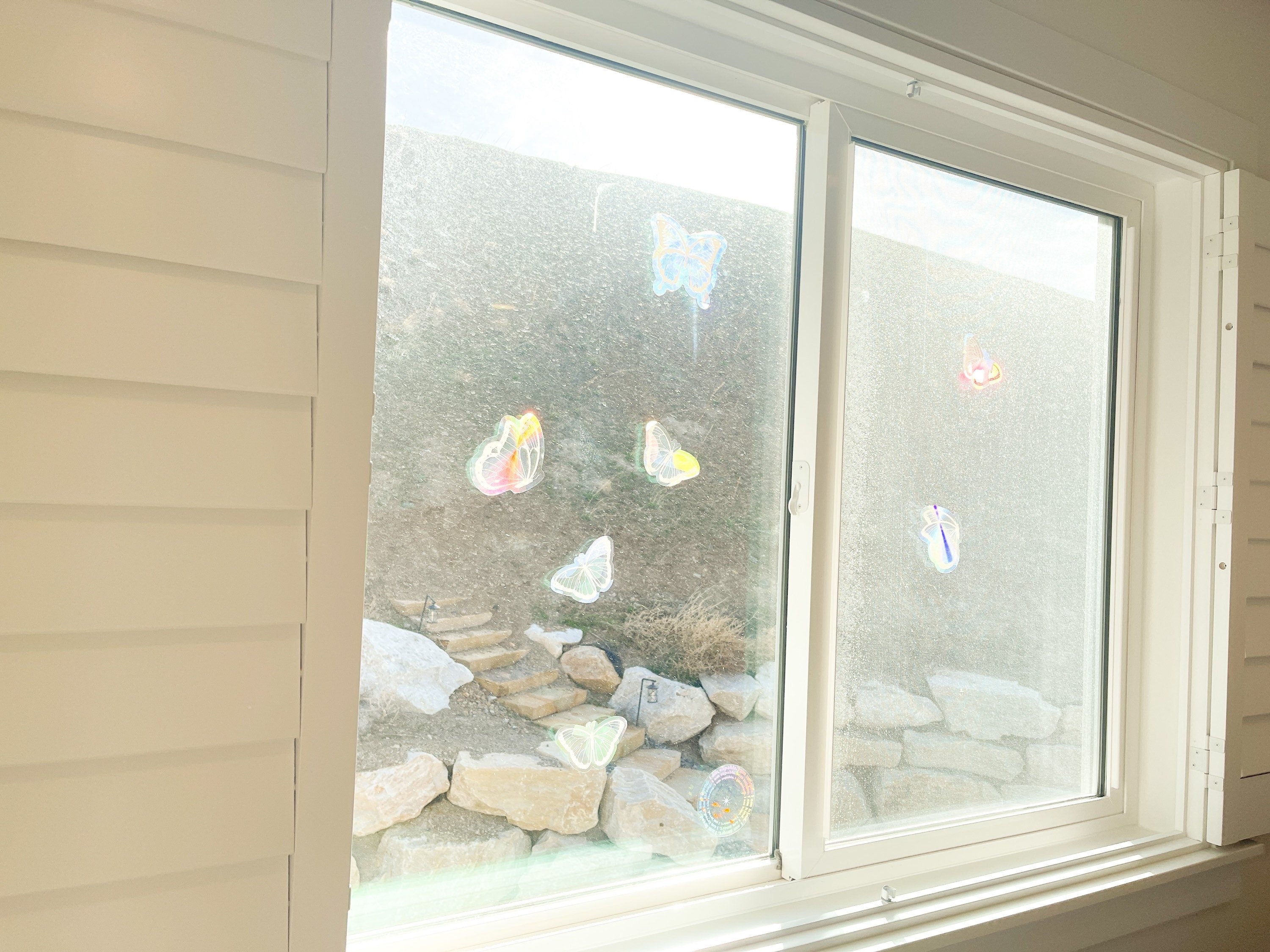 This Sun Catcher Window Sticker will brighten up your room! Hang this simple monarch butterfly design sticker on a window that gets direct sunshine. While in direct sun the sticker will cast beautiful rainbows all over your room! I love to change them in batches! Even on a cloudy day, you can see the rainbows on your window and still have a beautiful display in your room.