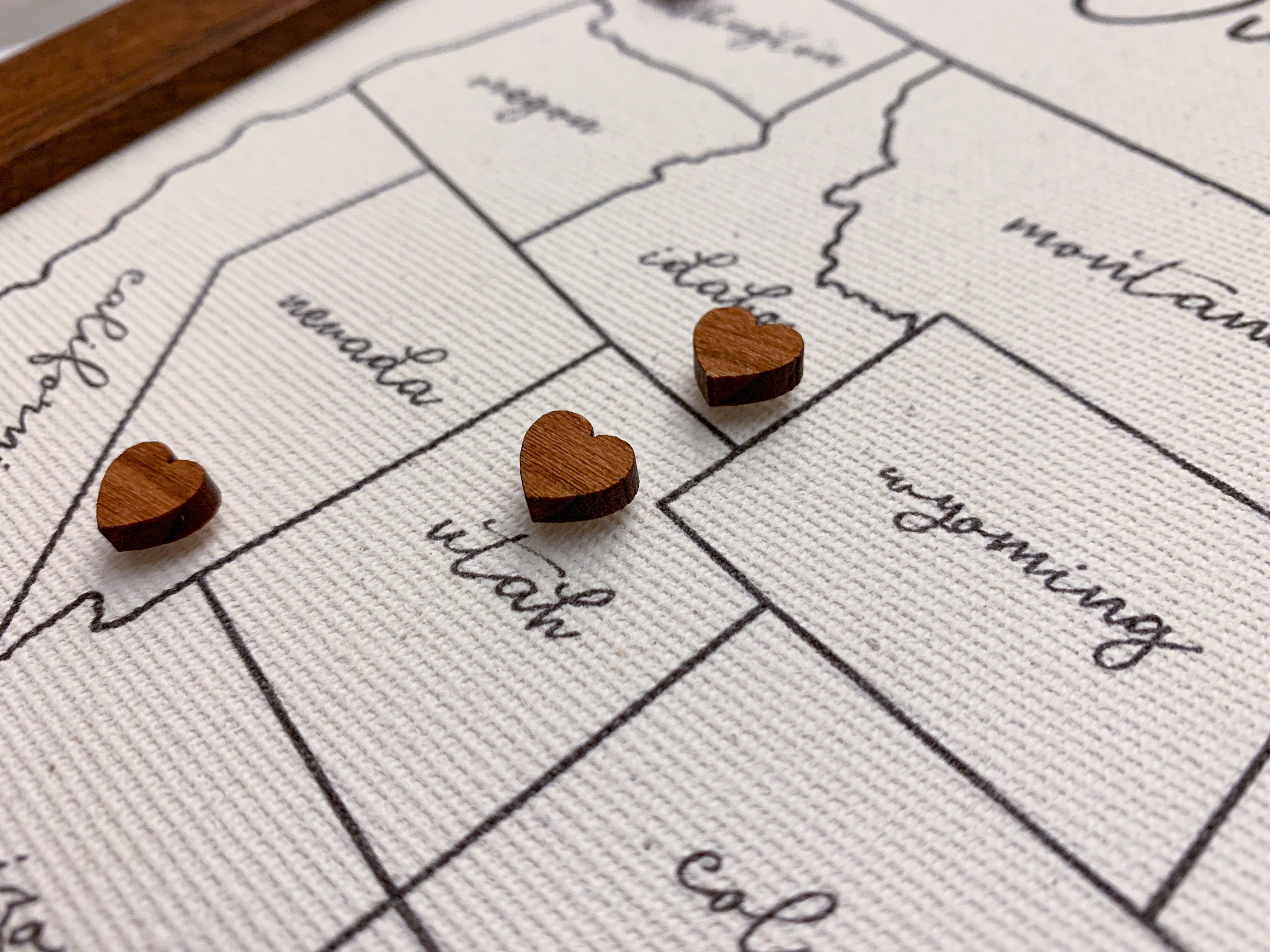 50 wooden heart pins are included and perfect for tracking travels! These pins are sustainably made in the US and are made by hand. They are small and sturdy and look amazing paired with the cotton canvas background! (Each order with wooden heart pins gives a portion of proceeds to help plant more trees!)