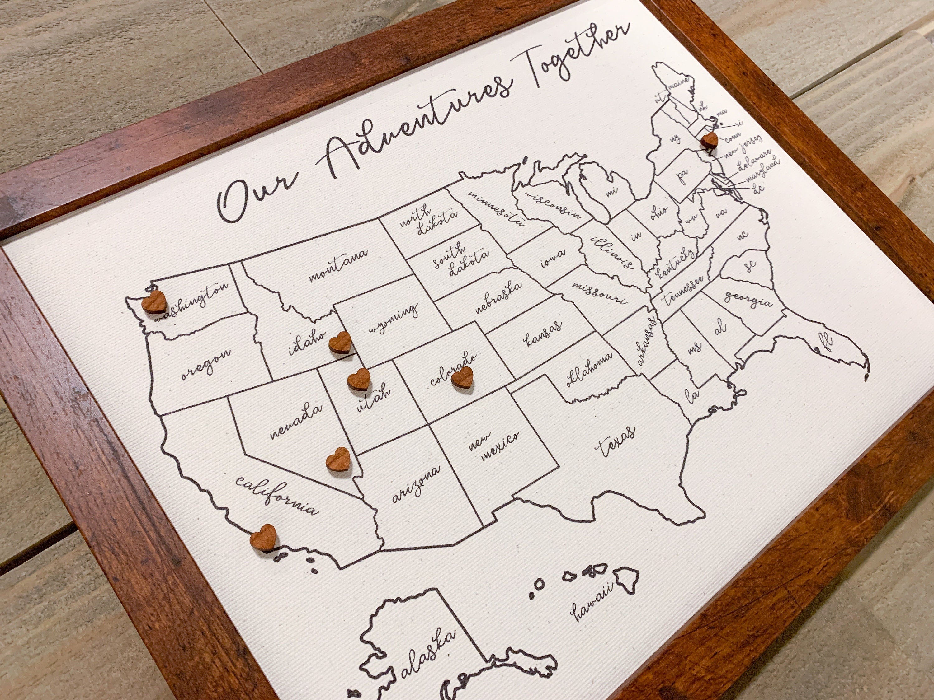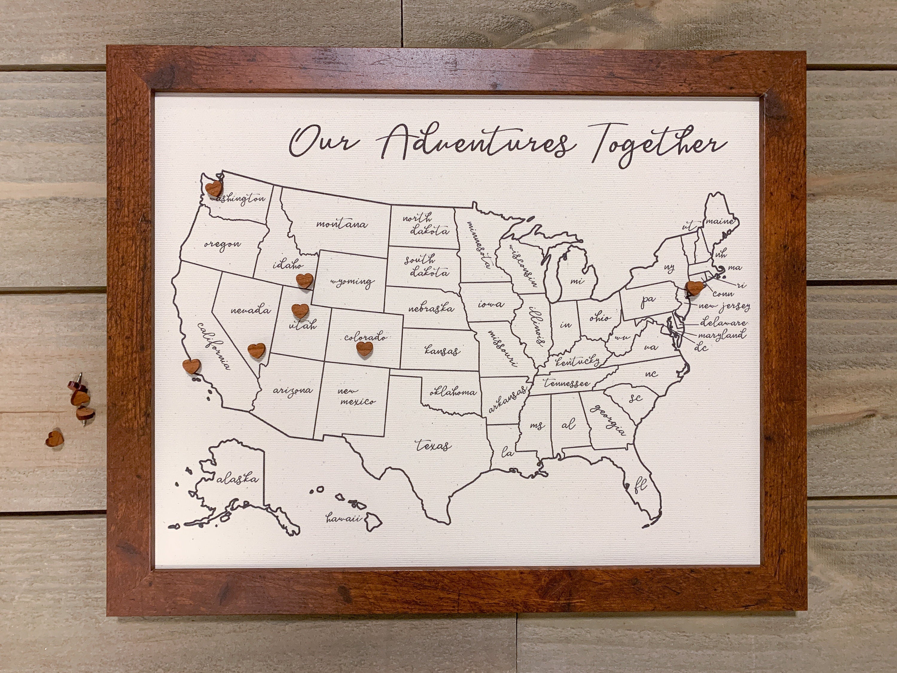 This stunning, custom, push pin map is the perfect way to track your travels! Printed on beautiful 100% cotton canvas and includes 50 wooden heart map pins. Framed and ready to hang! This best selling map has a simple design and subtle texture to the cotton canvas that will look stunning in any home style! Perfect wedding gift or anniversary gift!