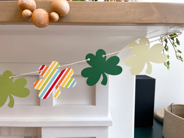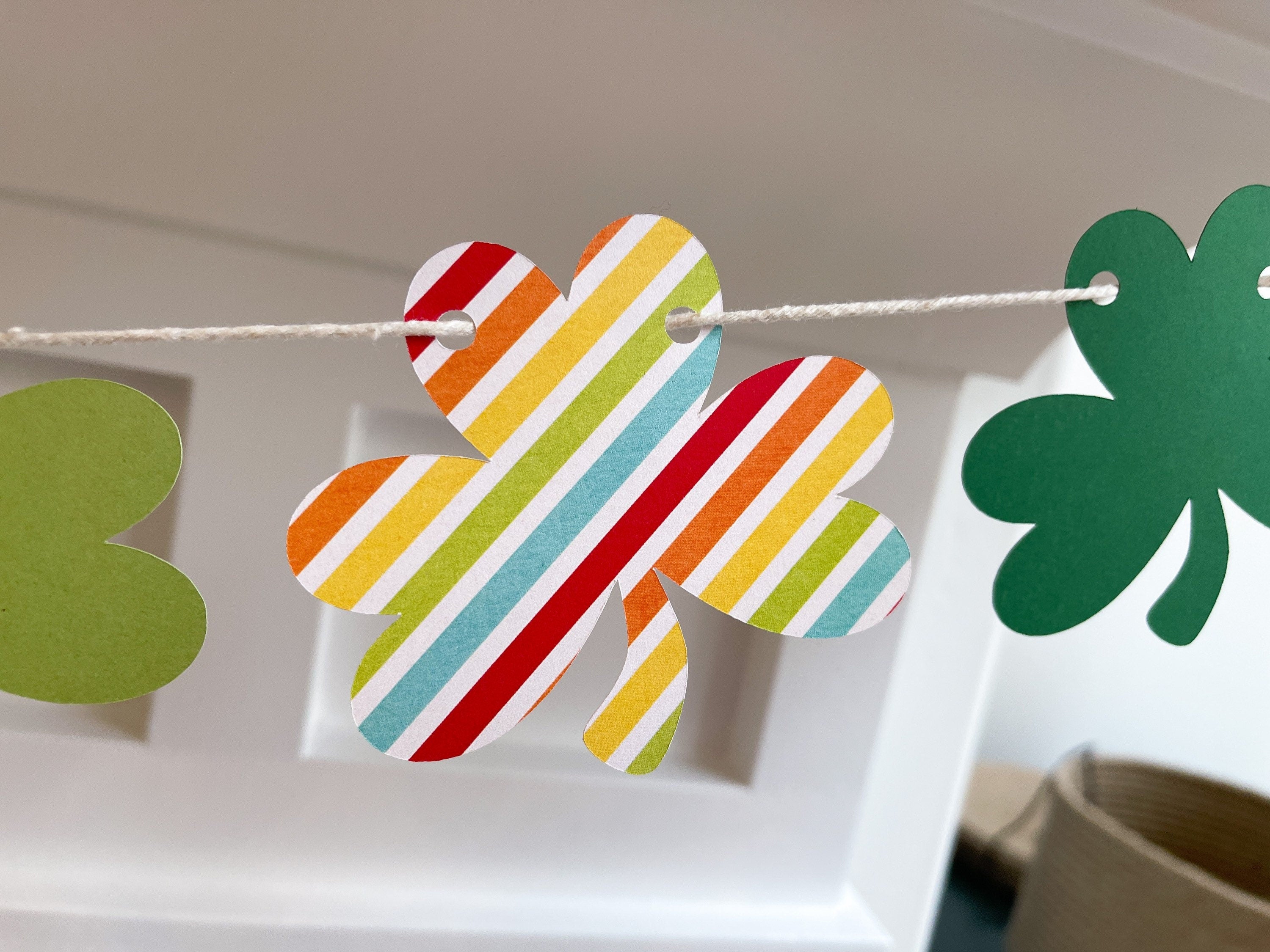 Introducing the Shamrock St. Patrick’s Day Garland - the perfect decoration to add some color and green to your home this March. This beautiful garland features several paper clovers, each measuring 3.2 inches across. Garland is made from a mix of coordinating paper, creating a unique and eye-catching display - some fun greens, rainbow stripes, champagne (gold) glitter, with stripes and polka dots!