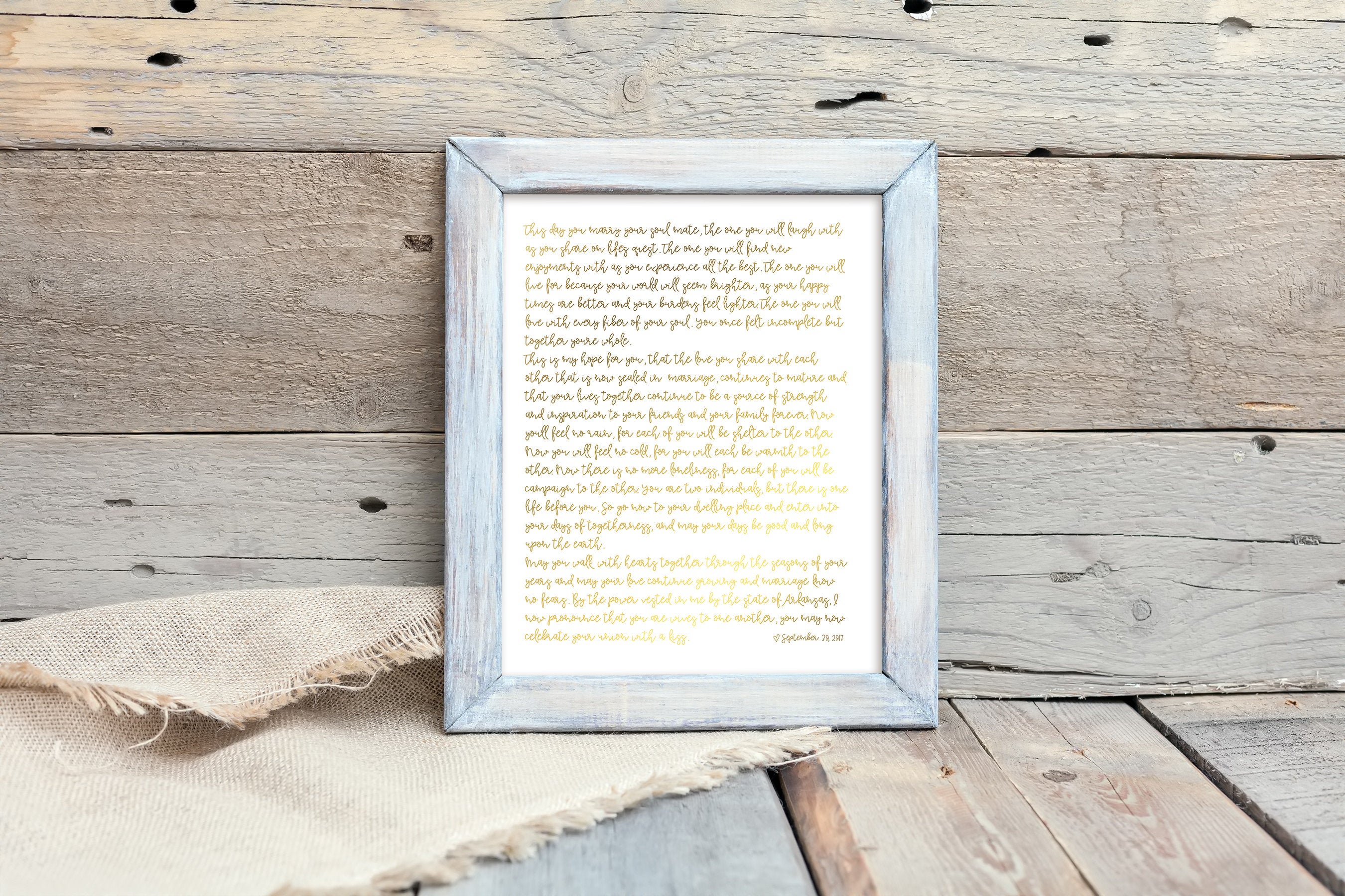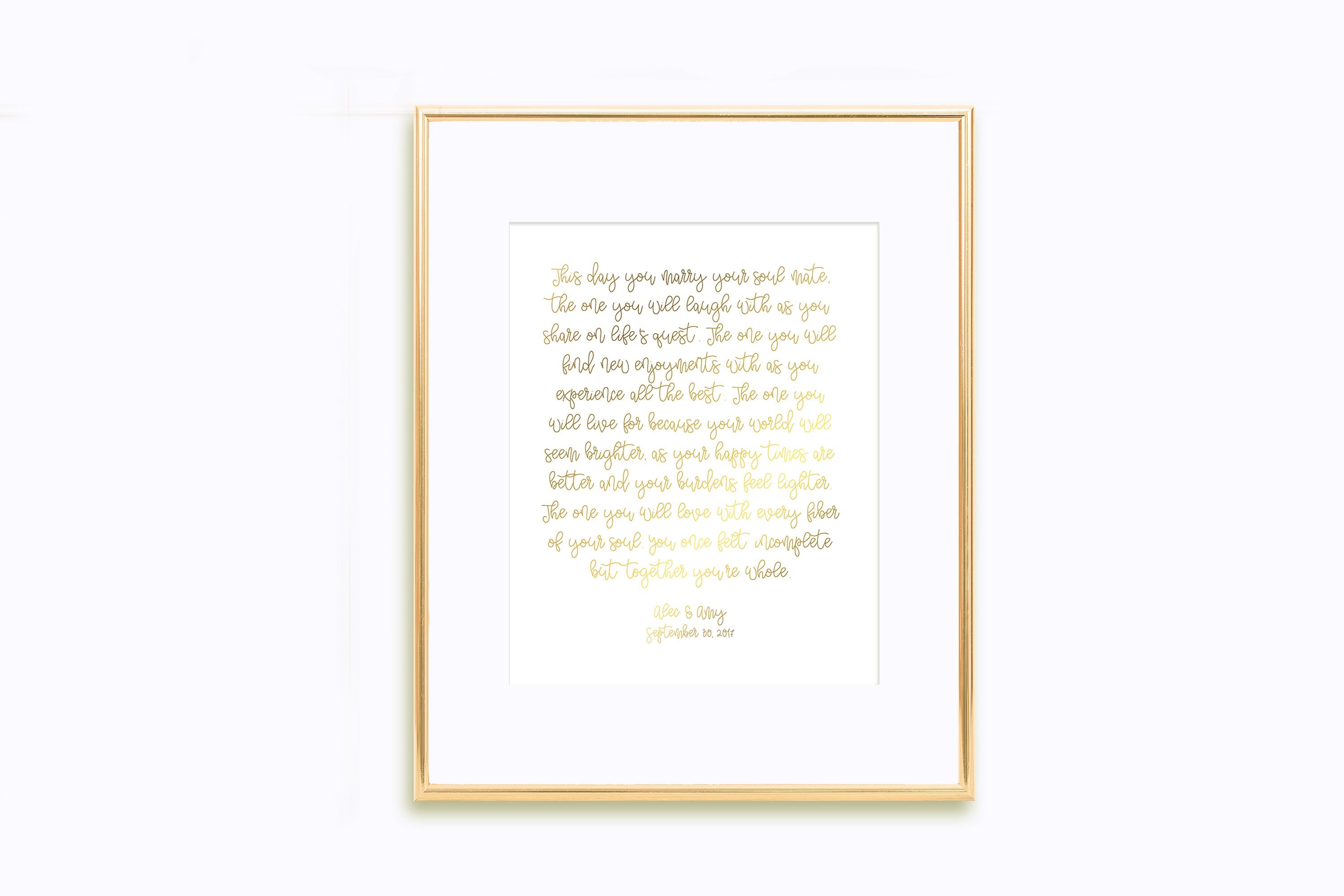 This custom real foil print is a great way to display your wedding vows or lyrics from your wedding song. Printed on high quality photo paper, this will be a stunning addition to your decor that you will love and cherish! Paper is the traditional first anniversary wedding gift - what better anniversary gift than a way to remember and see these meaningful words each day?