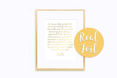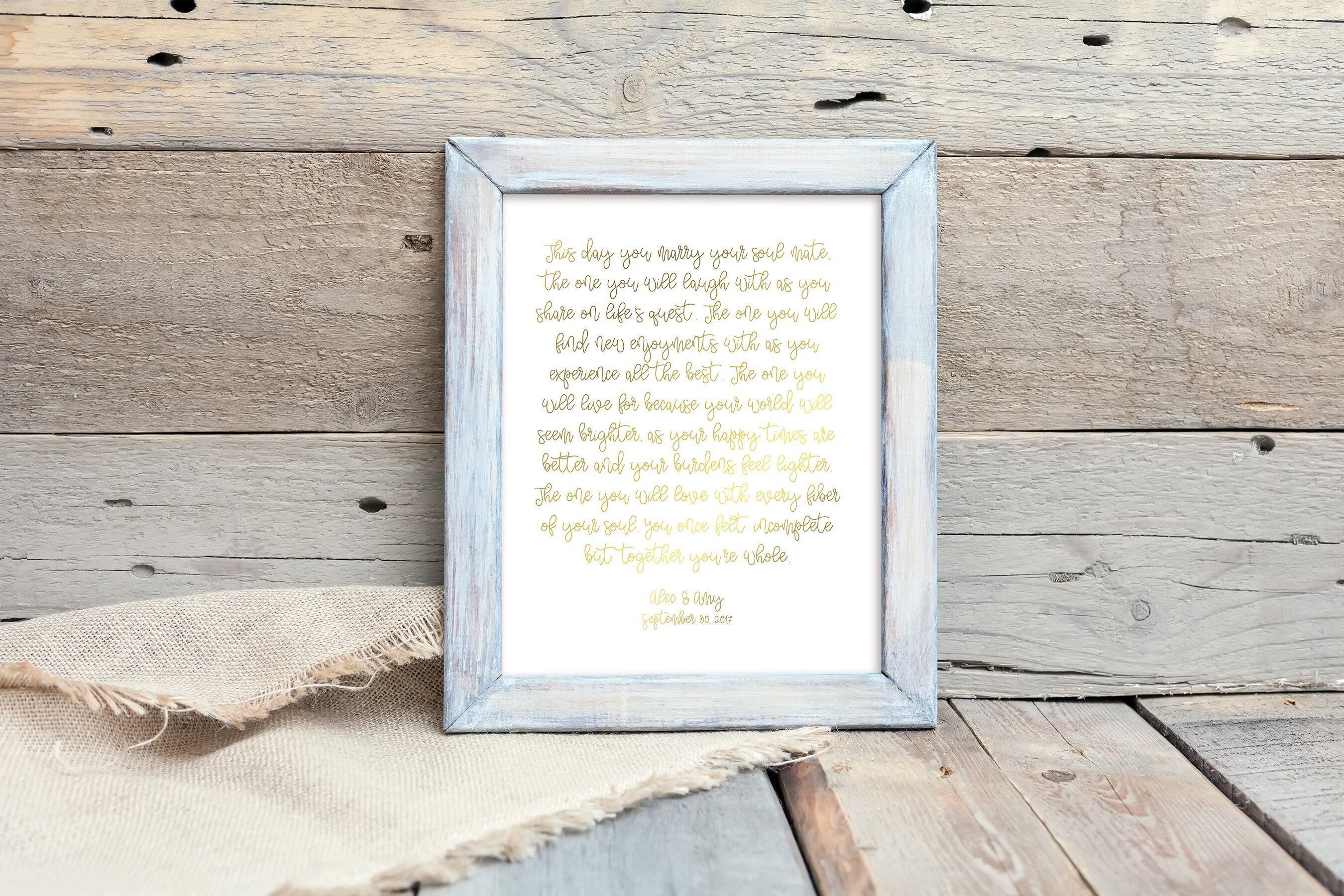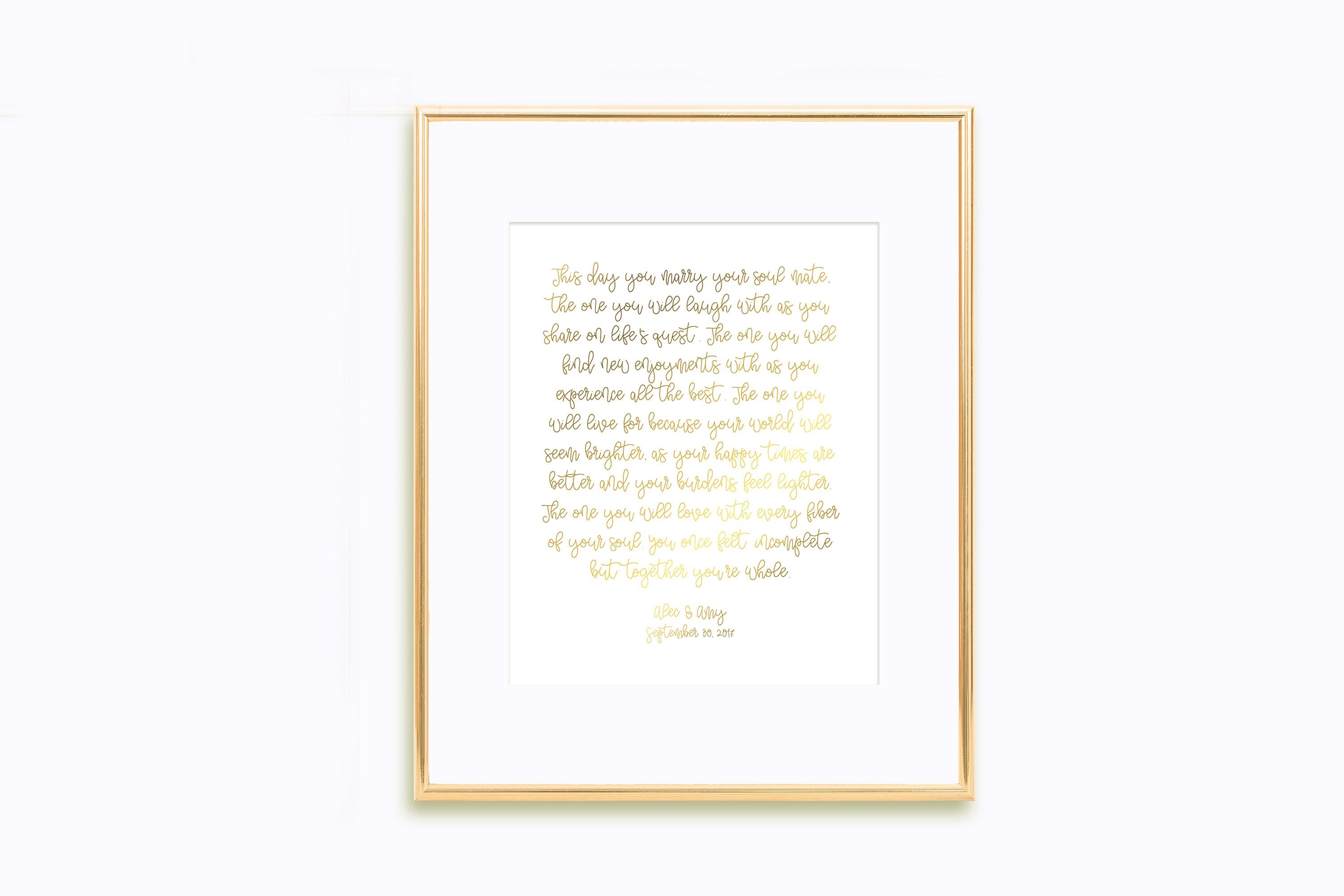 This custom real foil print is a great way to display your wedding vows or lyrics from your wedding song. Printed on high quality photo paper, this will be a stunning addition to your decor that you will love and cherish! Paper is the traditional first anniversary wedding gift - what better anniversary gift than a way to remember and see these meaningful words each day?