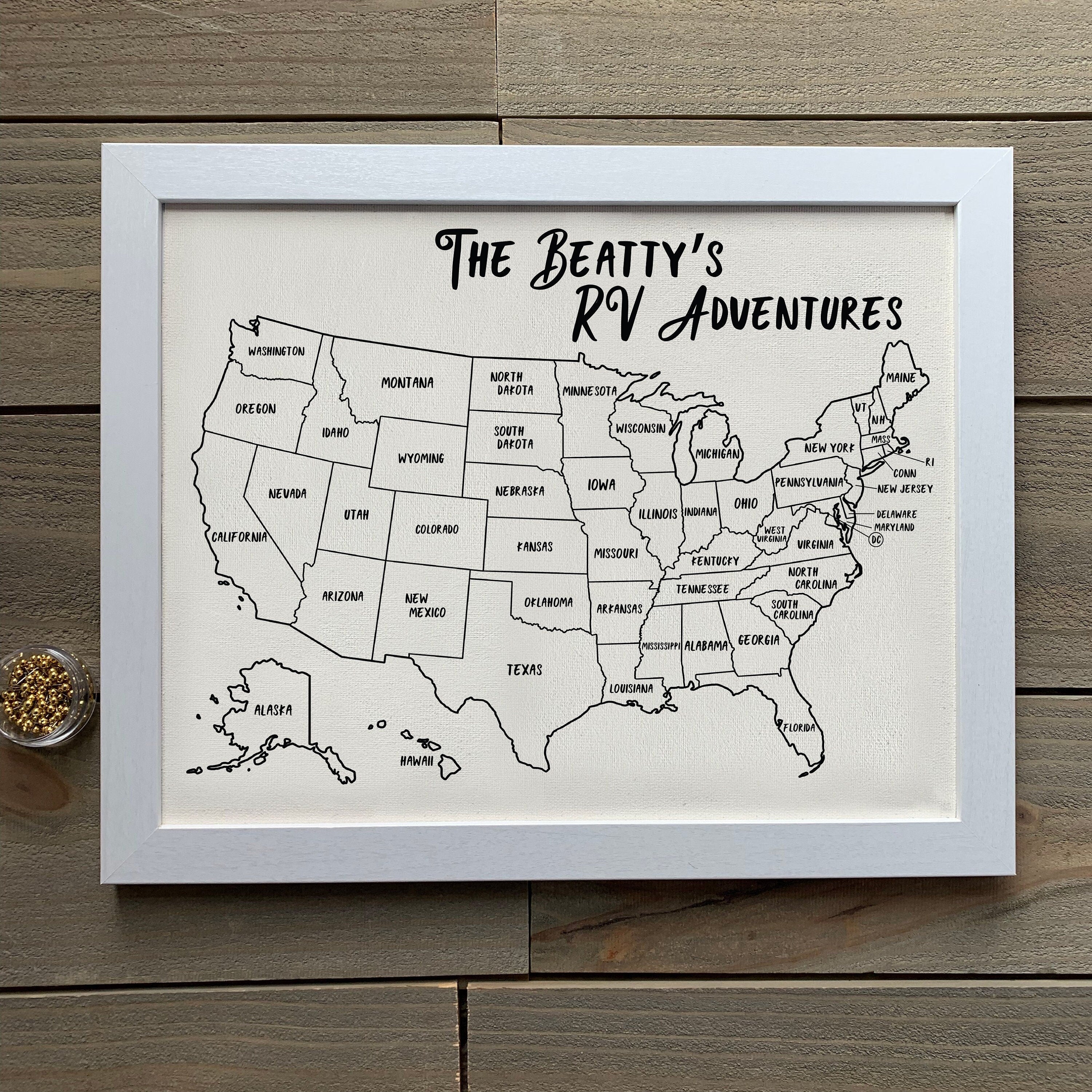 This beautiful map will be the perfect addition to your RV or Van as your travel around the country and track your adventures! This map makes the perfect gift for a loved one who loves the adventures life in an RV or van and makes the perfect accessory/decor for life on the go!