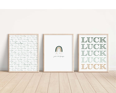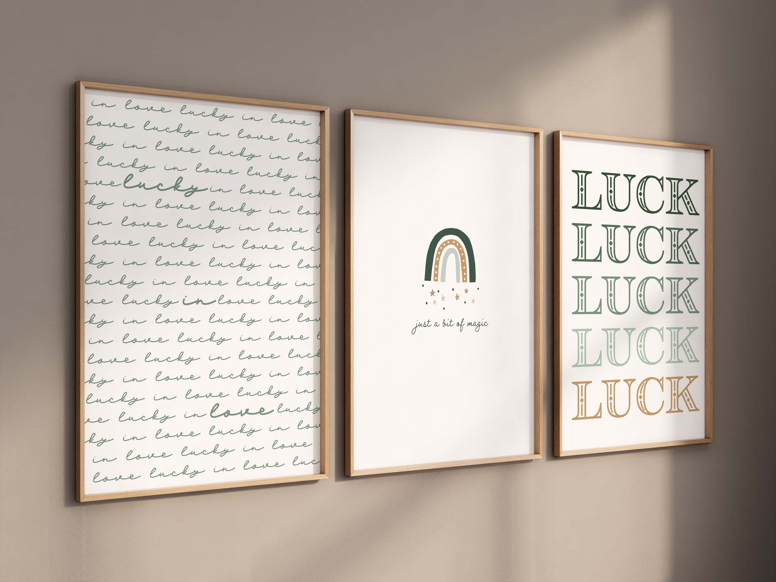 Introducing the St. Patrick's Day Gallery Set of 3, the perfect addition to your minimalist home decor collection. This set includes three high-quality digital downloads featuring cute rainbow graphics and charming sayings like "A bit of magic" and "lucky in love".