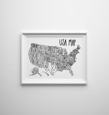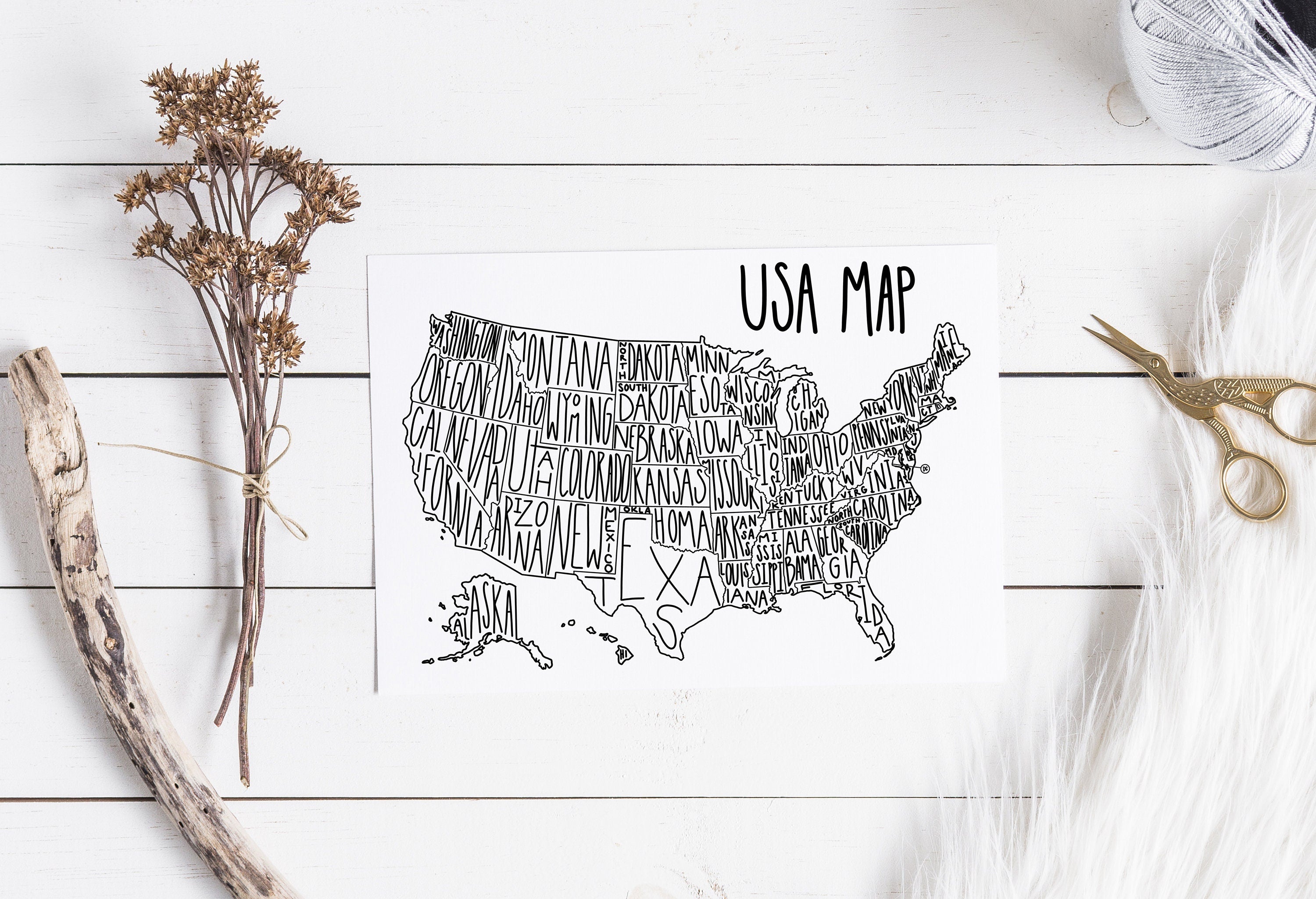 This is a digital download of a USA map with the title 'USA Map'. Perfect for tracking vacations, sales or just for some fun wall art! It's fun to track your progress, no matter what your goal was and see how far you've gone! Black and white style with hand lettered state names.