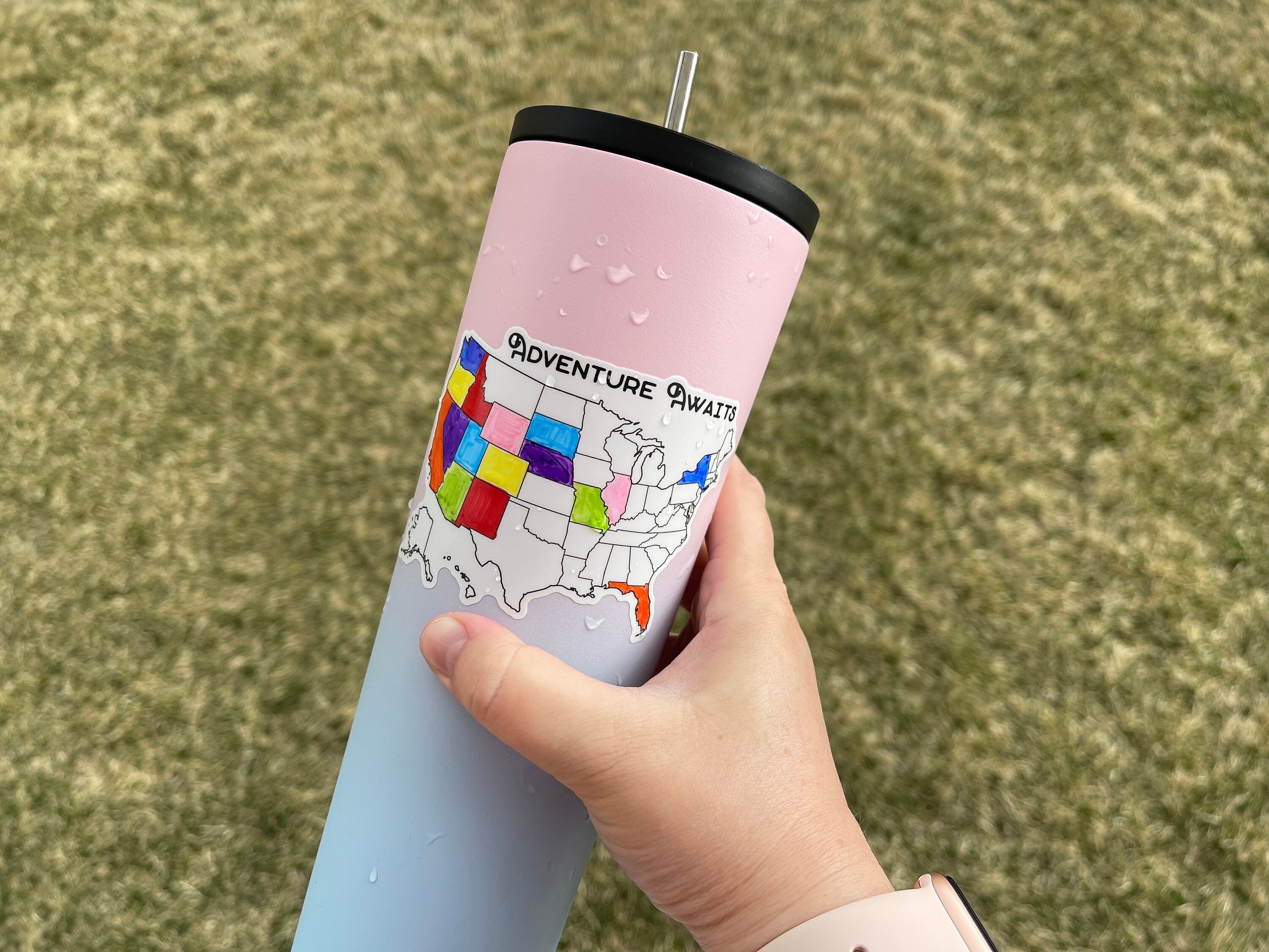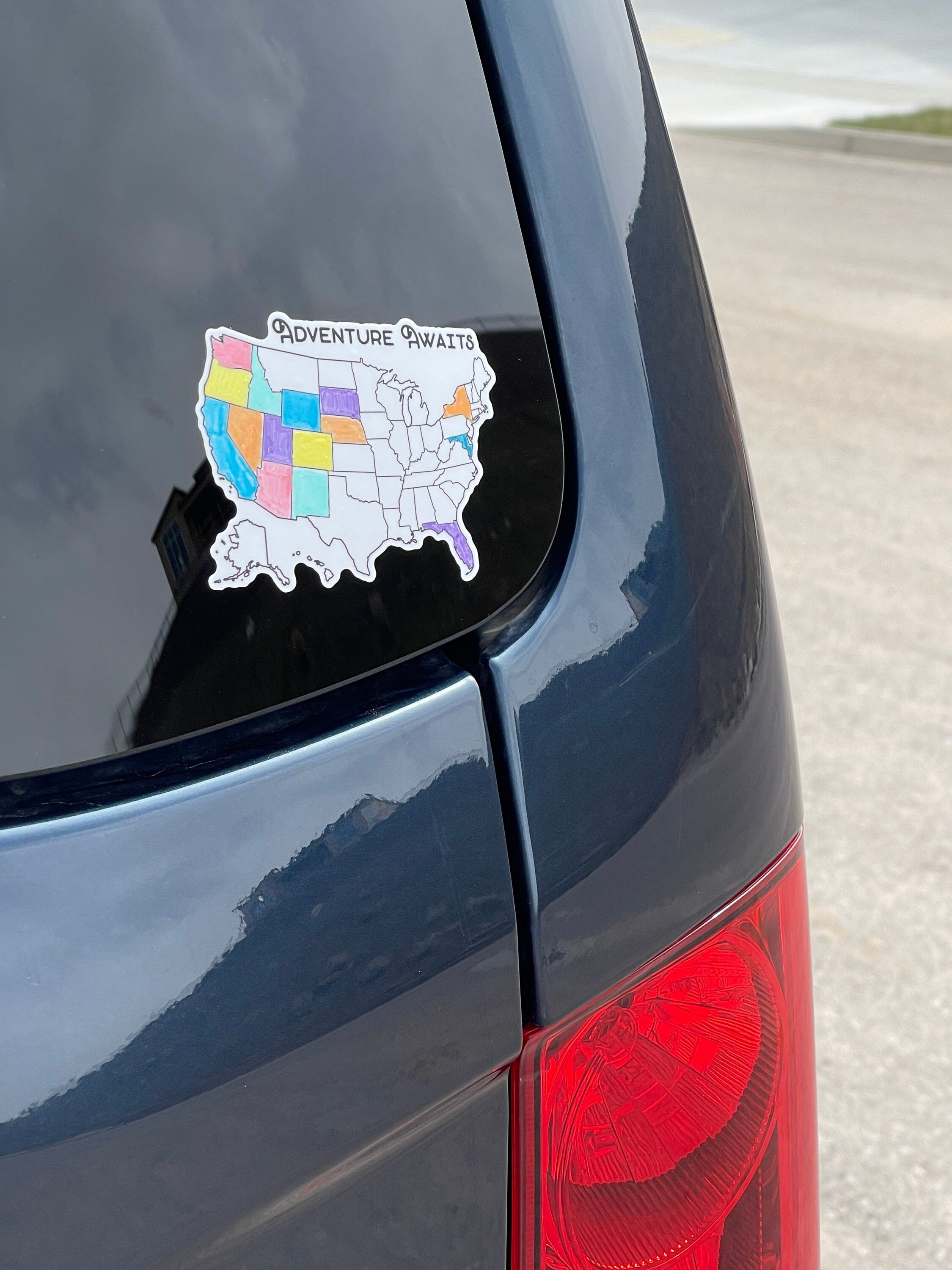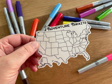 Take your State and adventure tracking on the GO with my new United States sticker! This high quality, vinyl sticker is waterproof and weather resistant. The mat finish is perfect for coloring! Use your favorite permanent markers, I have found that PAINT PENS work best for outdoor use!