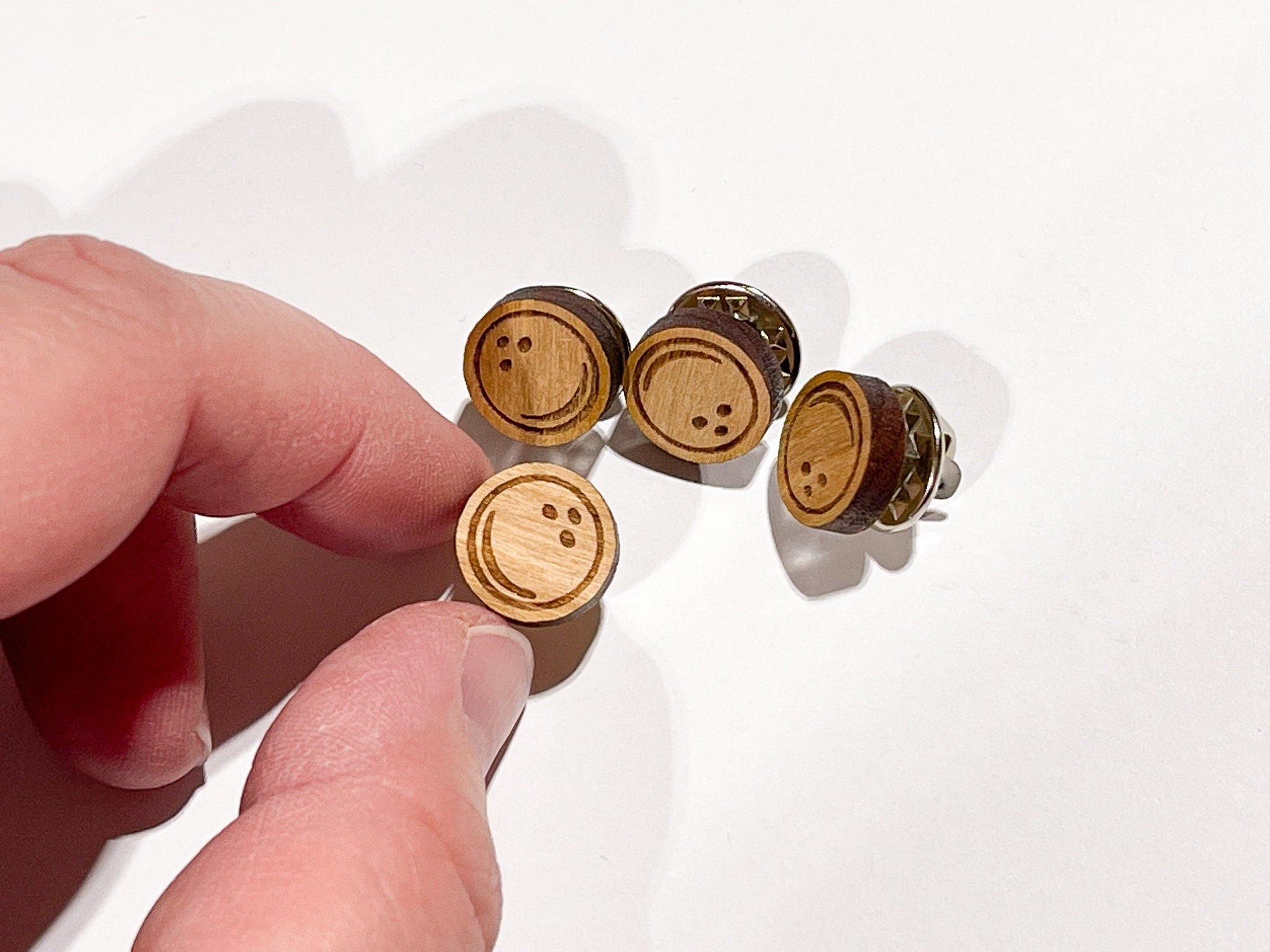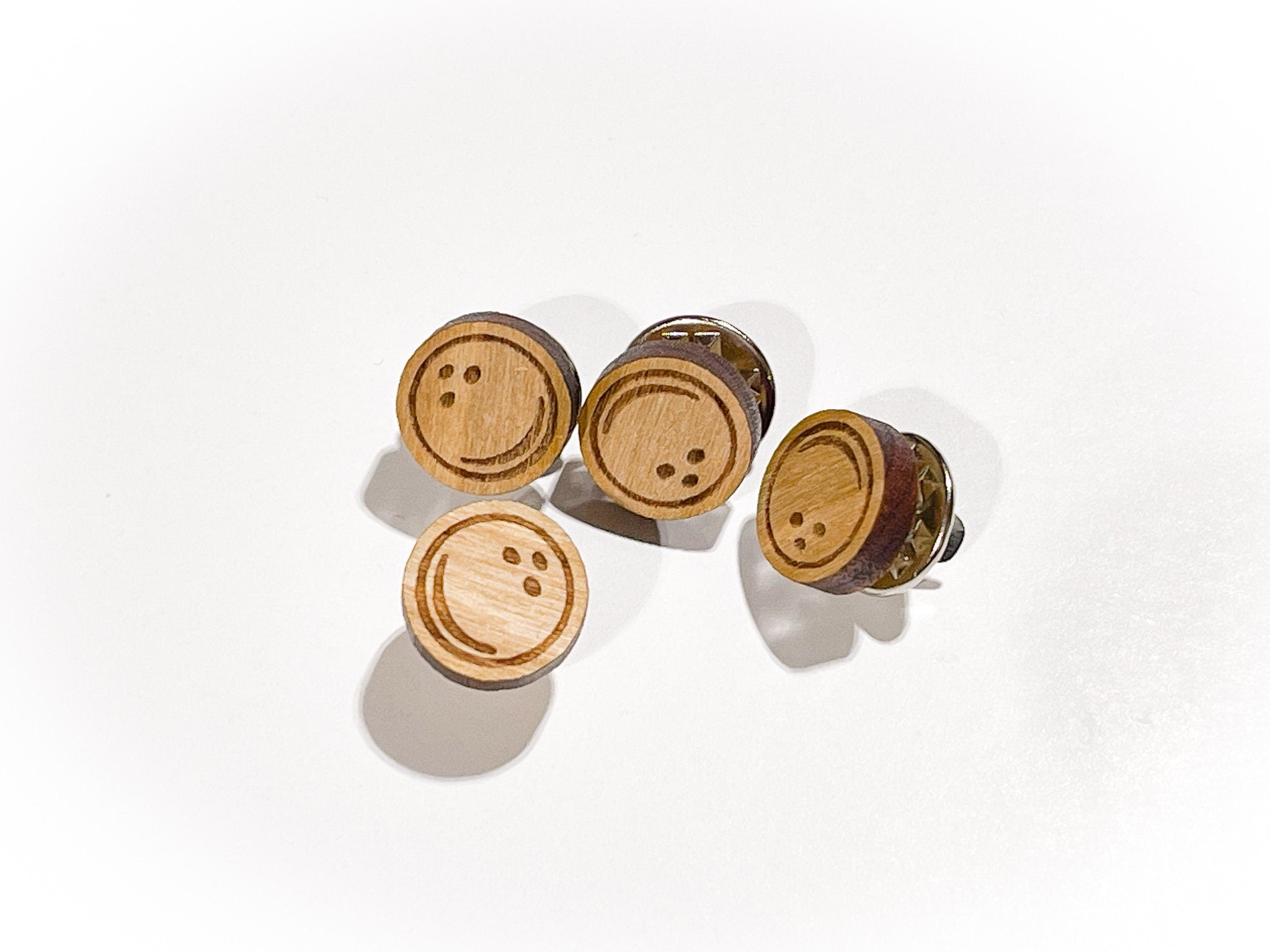 Bowling Ball shaped wooden pins with classic pin and butterfly clasp.