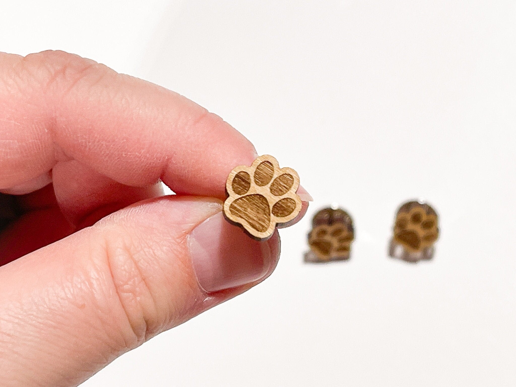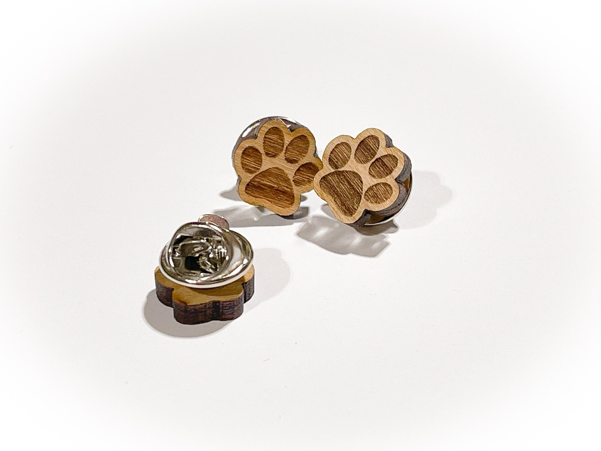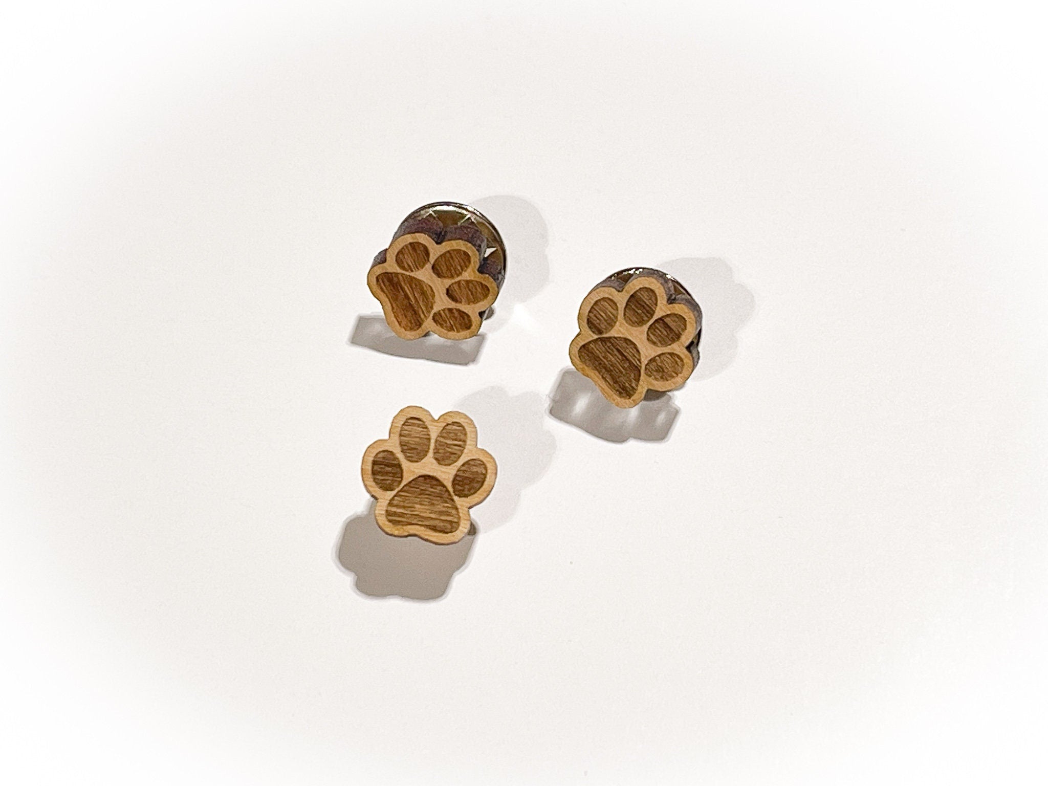 Paw Prints shaped wooden pins with classic pin and butterfly clasp.